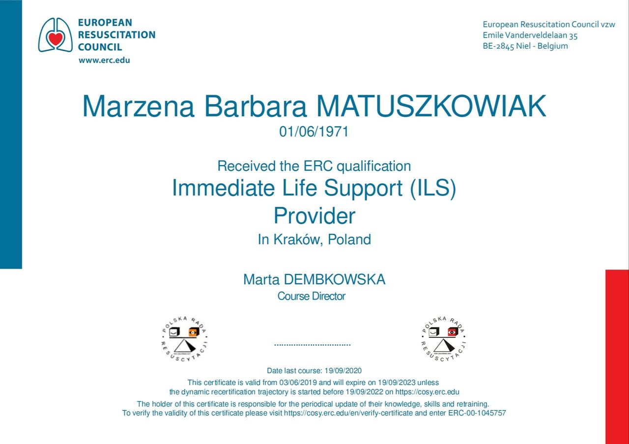 I work in London. I regularly attend international conferences and trainings, and I share my experience with students and junior doctors. I am a member of the Royal College of General Practitioners and hold licences with the General Medical Council and the Wielkopolska Chamber of Physicians.